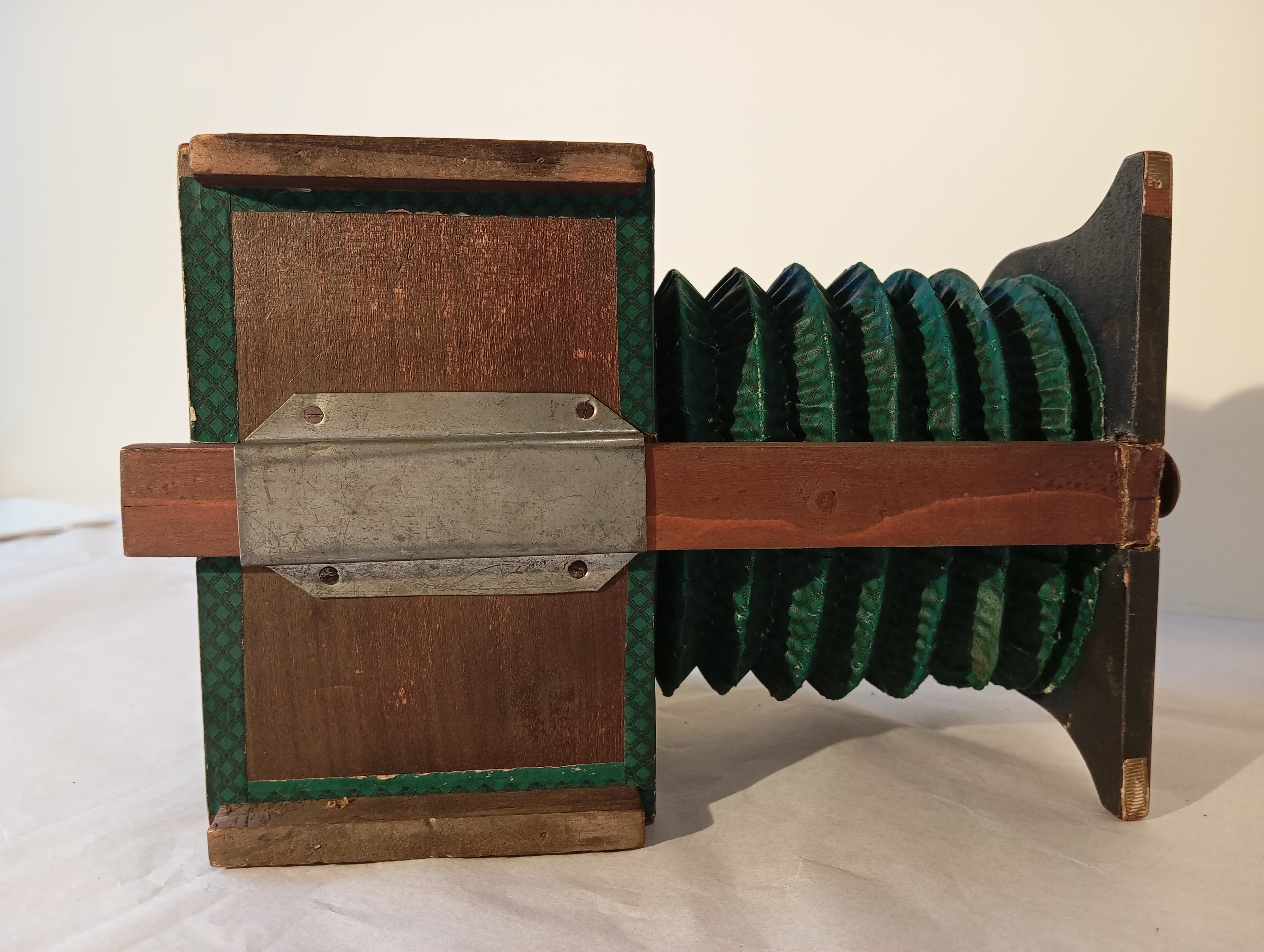 | • a stabilizer for the bellows (On larger models, this stick is hinged and when retracted, folds up to close over the back of the box); | ||