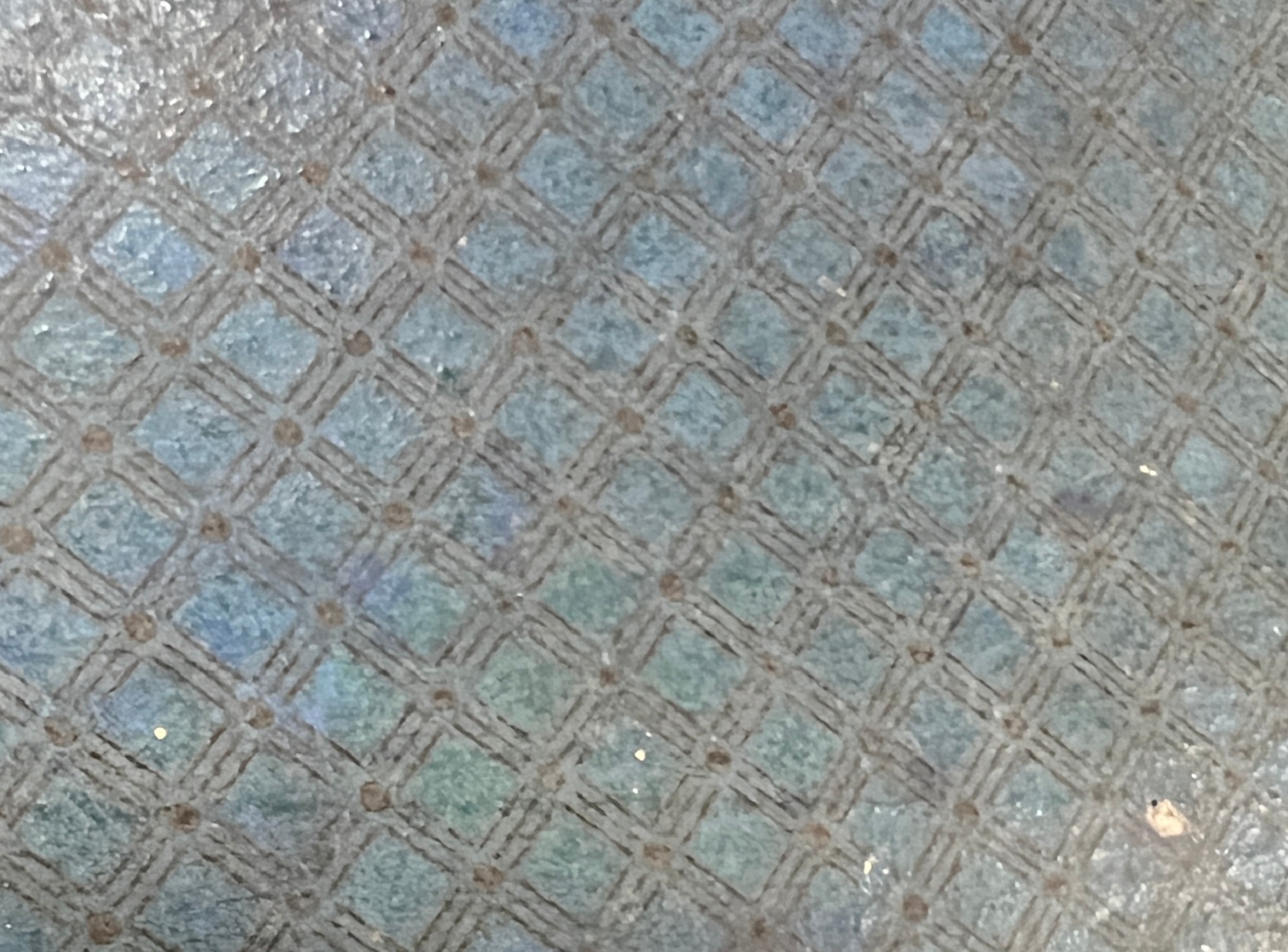 The lens is turned to a typical pattern for this workshop: inner and outer double ridges separated by a valley (figure M04936.2). The green patterned paper is also typical, but the pattern varies. I will call this one the eixample grid because it reminds me of the plan of the Eixample in Barcelona: square blocks with "streets" that have centre-lines and dots at the intersections.