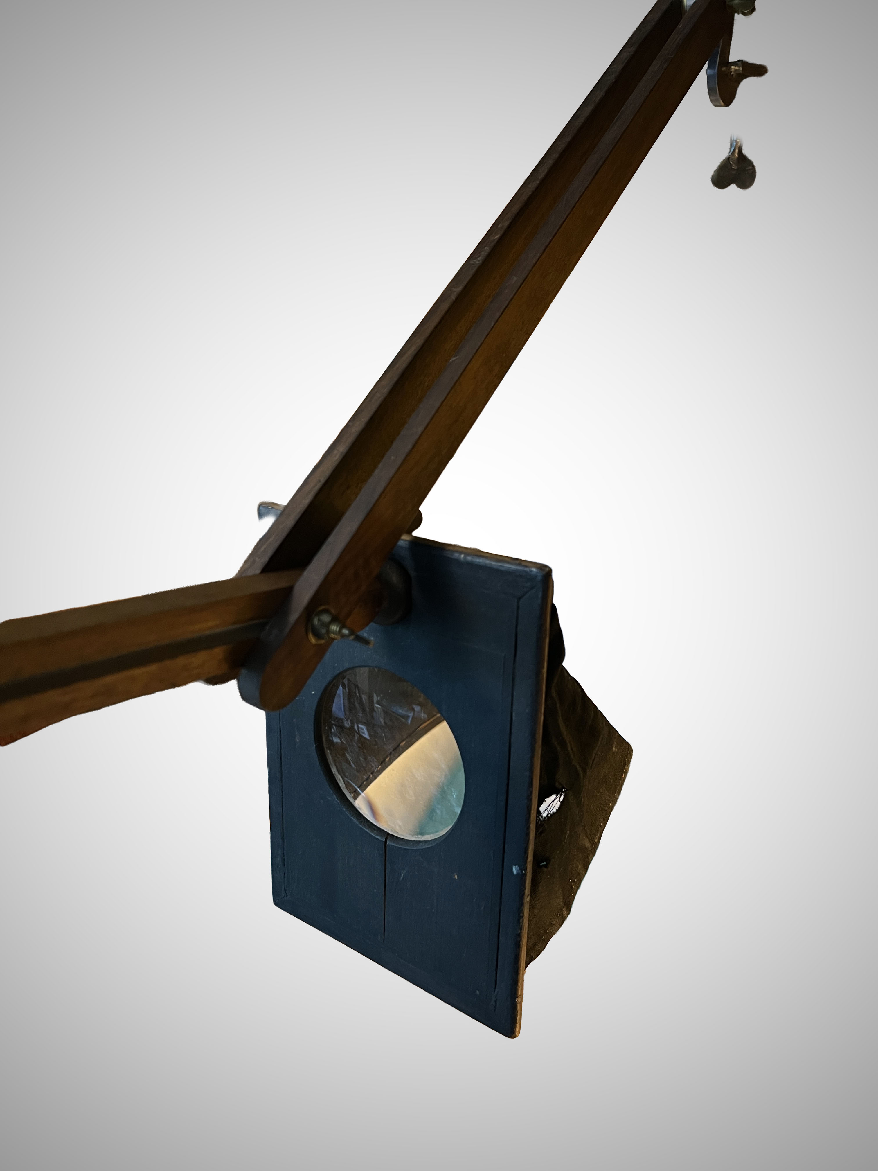 I have never seen or heard of a zograscope designed this way. The lens-mirror assembly is suspended from a two-part folding arm at the end of which is a clamp. The original clamp was missing and it came with a crudely-fashioned replacement too narrow to attach to anything and probably too weak to hold. The original design aesthetics is rather straight-edged with the exception of decorative wing-nuts. My clamp takes inspiration from the wing-nuts.