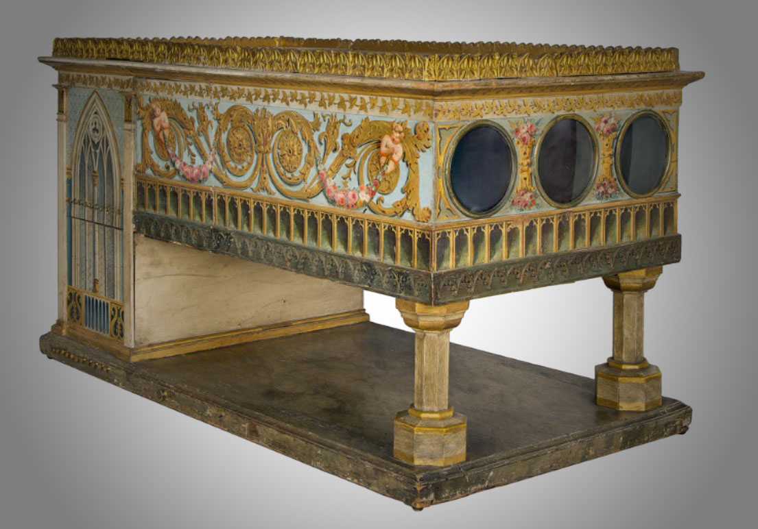 | Raree Show | Mondo Niovo | Rarekiek | Kulissentheater | Dolfini Teatro Rotondo | Friggeri Tower | Cloth Box | Boite d'Optique | Gainsborough's Show-box | Viola Guckkasten | |