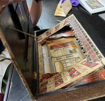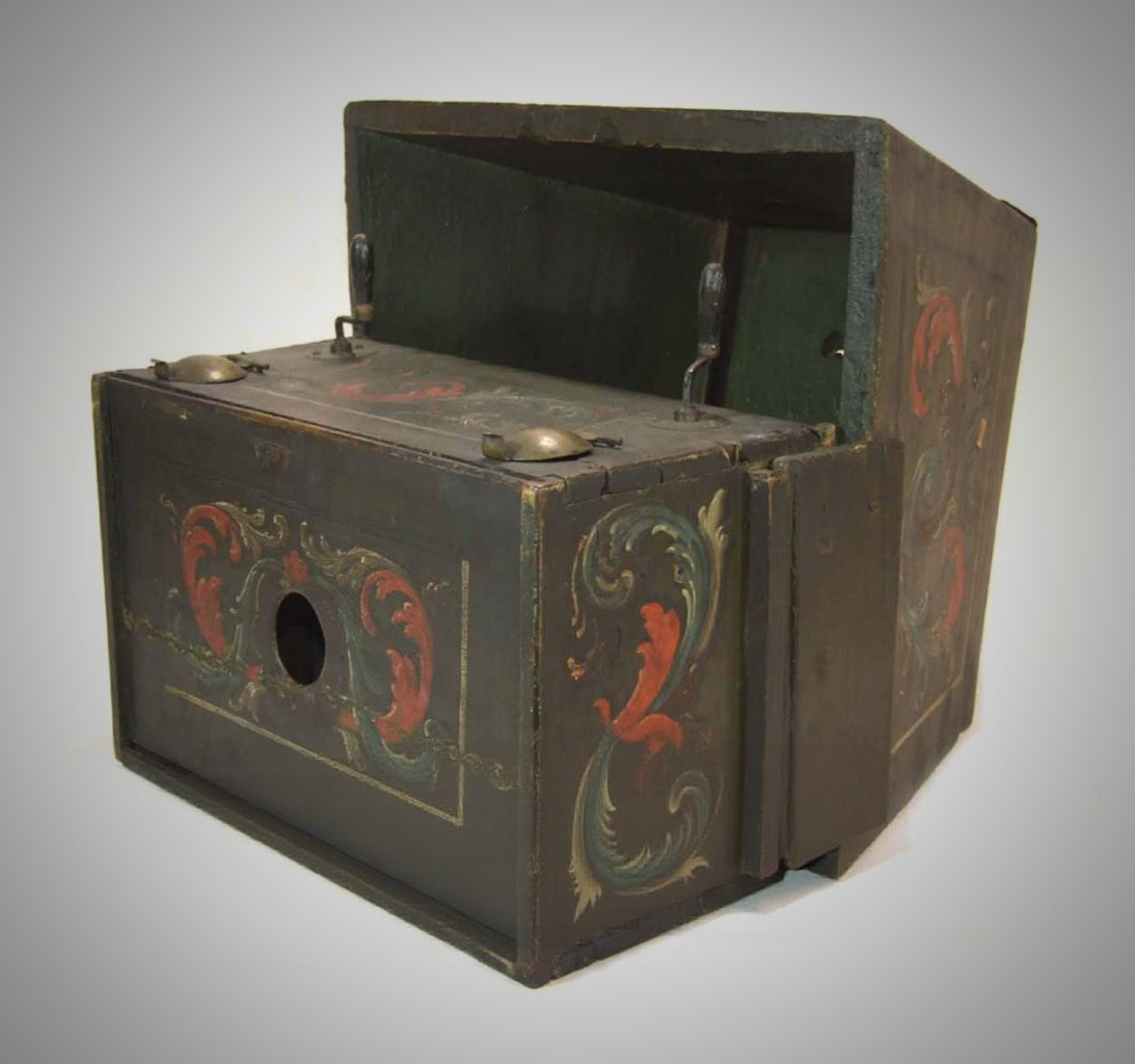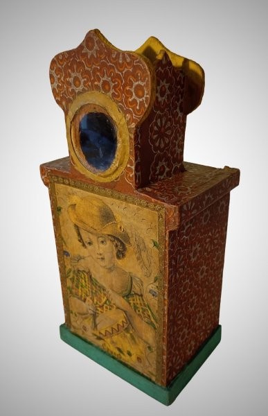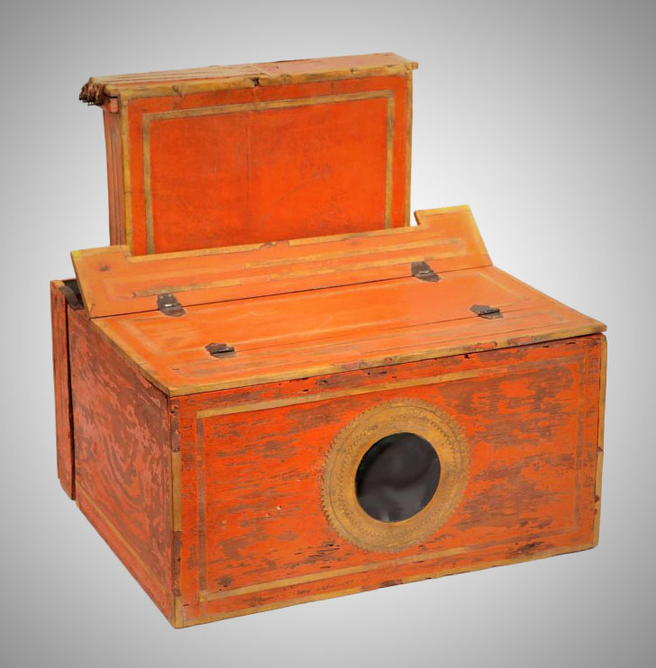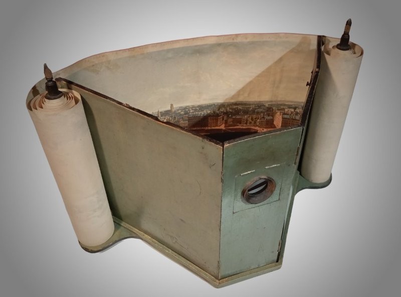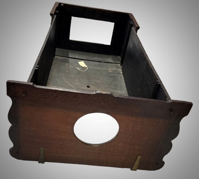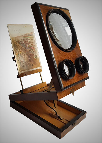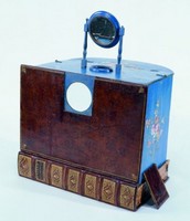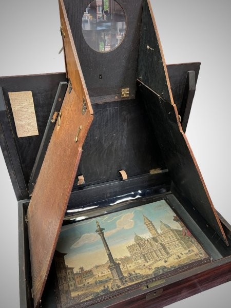 Categories: There is a lot of confusion about the different types of optical machines and what to call them. The same terms, like "raree show" or "cosmorama", are sometimes used for very different things, so that it is impossible to be sure what a writer is referring to when they use them unless they give a clear description or supply a picture. Descriptions are often inadequate because writers rarely have technical knowledge of how such devices work and what to look for to characterize their differences. Drawings or paintings often suffer from the same deficiency on the part of the artist. Even photographs can be insufficient because they do not show inner workings or measurements. We rely on the materiality of the devices and their location within the broader context of other devices to make clearer distinctions.
