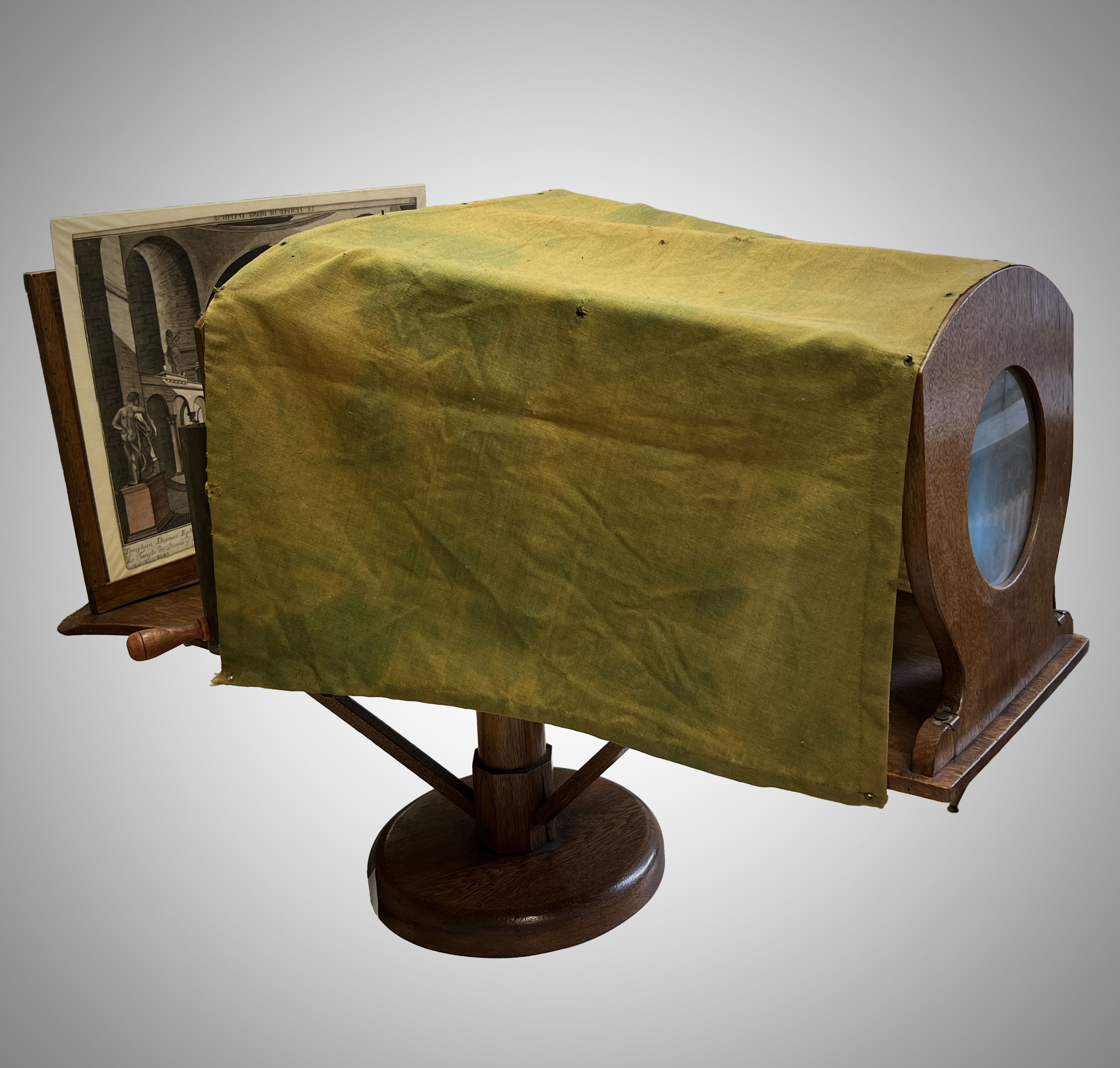At the back of the cloth cover there is a removable mask which you can see in the video. When removed, it leaves a slightly wider mask. The Cosmoscope also has interchangeable masks to frame different sized images. Perhaps this feature was designed for the same purpose in this device, although we do not have evidence of the appropriately-sized vues d'optique.