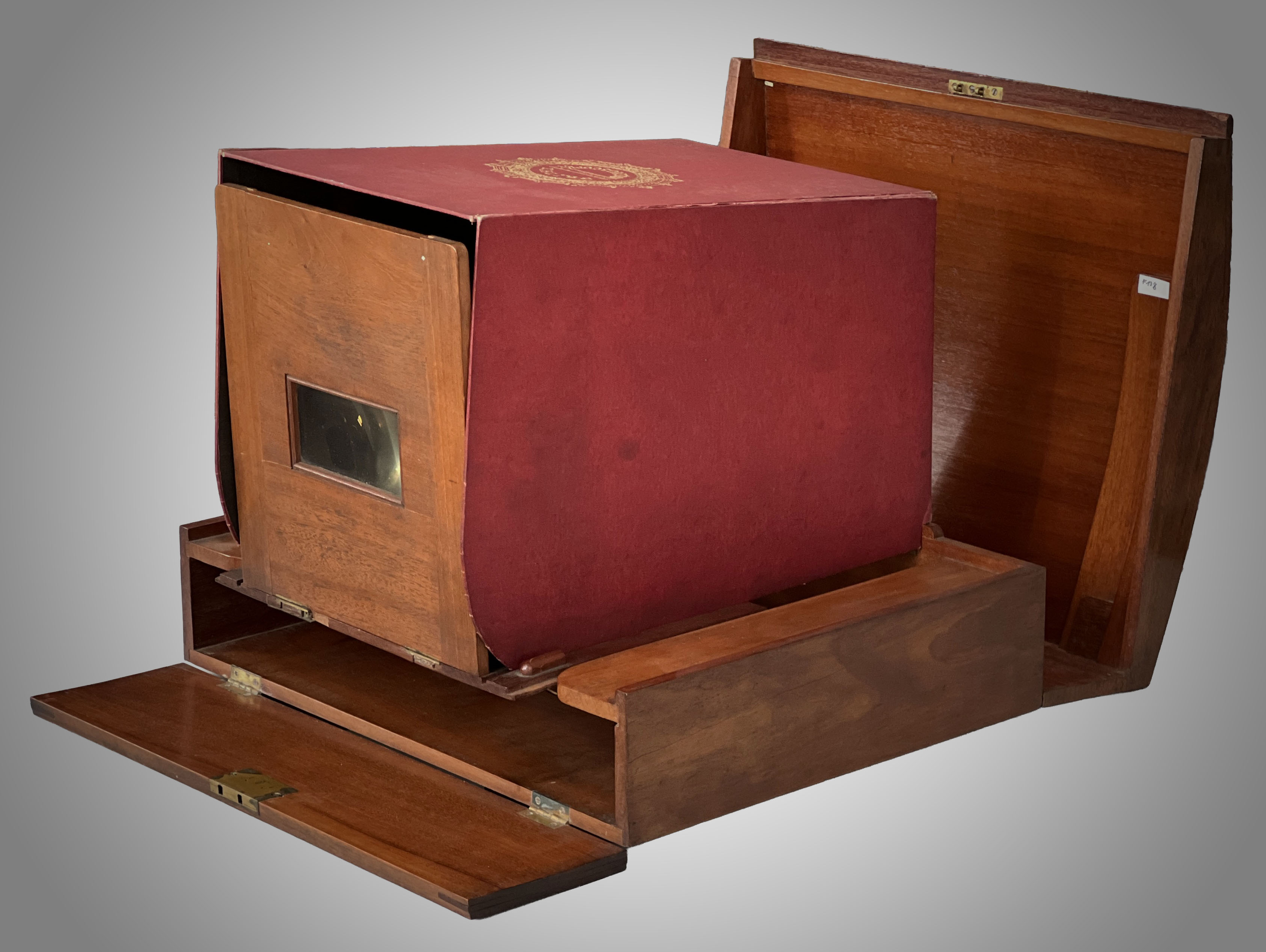 Francis Frith (1822-1898) designed this device probably on the inspiration of Carlo Ponti's Megalethoscope (or Alethoscope, 1861). The Megalethoscope, Neomonoscope (1860), Cosmoscope and Graphoscope (1864) were the first biconvex-lens viewers designed specifically for photographs. They are testament to the optical machine's ongoing ability to merge with new technologies.
