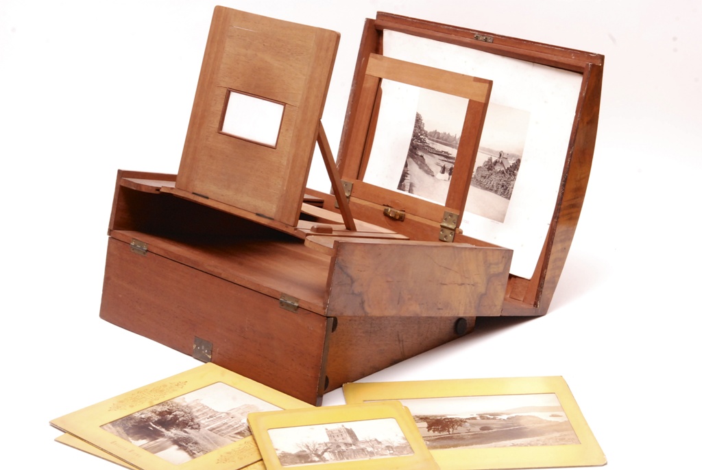 | This example, for sale by Antiq Photo (Paris) has included with it Frith's specially-mounted images. Note how the front flap folds under and, along with two wedge-shaped flaps, tilts the device up towards the observer. Photo © Antiq Photo, Paris. |