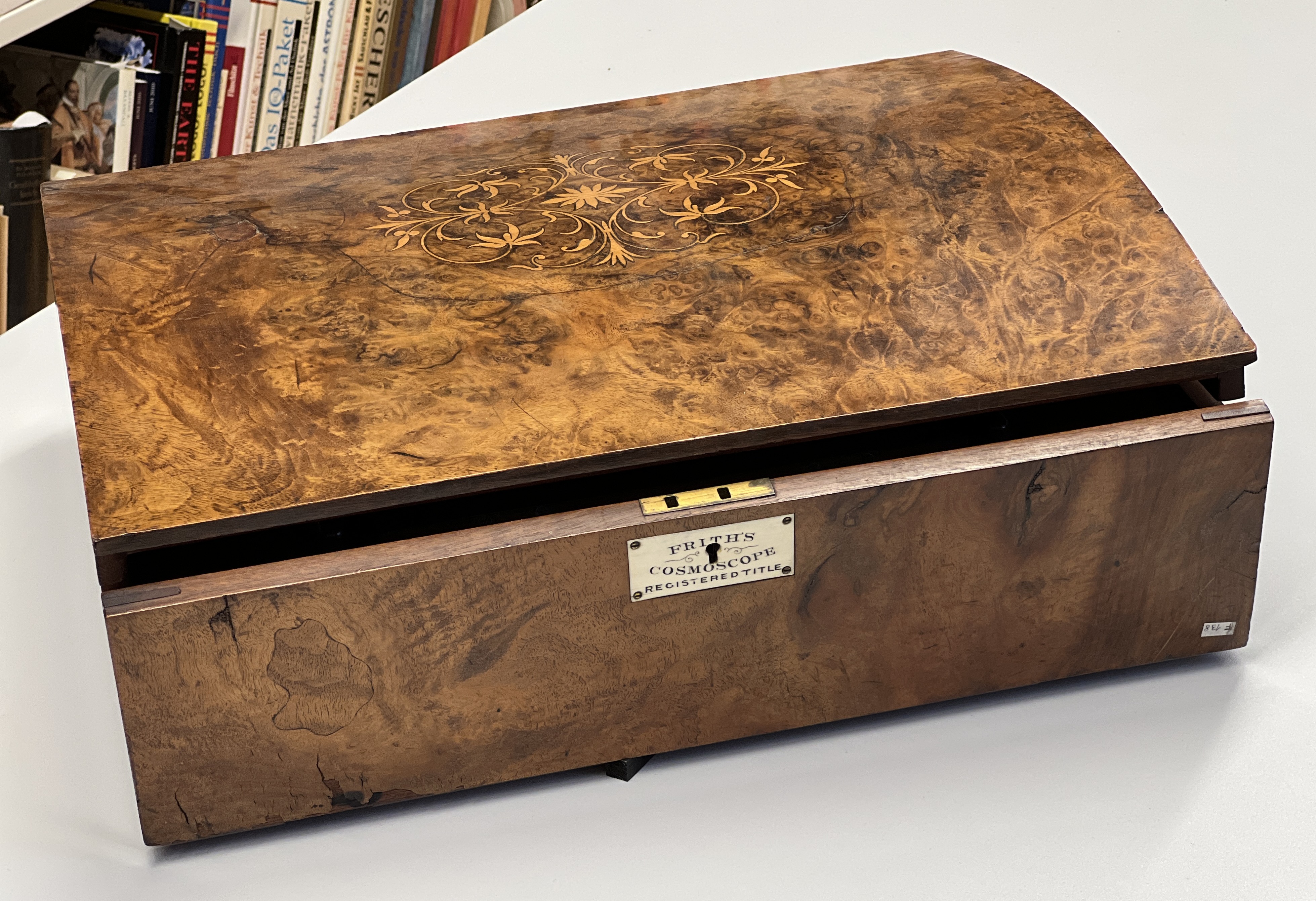 The Cosmoscope folds up like a little treasure chest (Figure GT49.3) with a burled walnut top decorated with inlay. The box is of mahogany with a brass lock and ivory escutcheon that doubles as an elegant maker's mark. The workmanship is of high quality. Frith clearly intended it for an exclusive clientele capable of purchasing many of his specially-mounted prints.