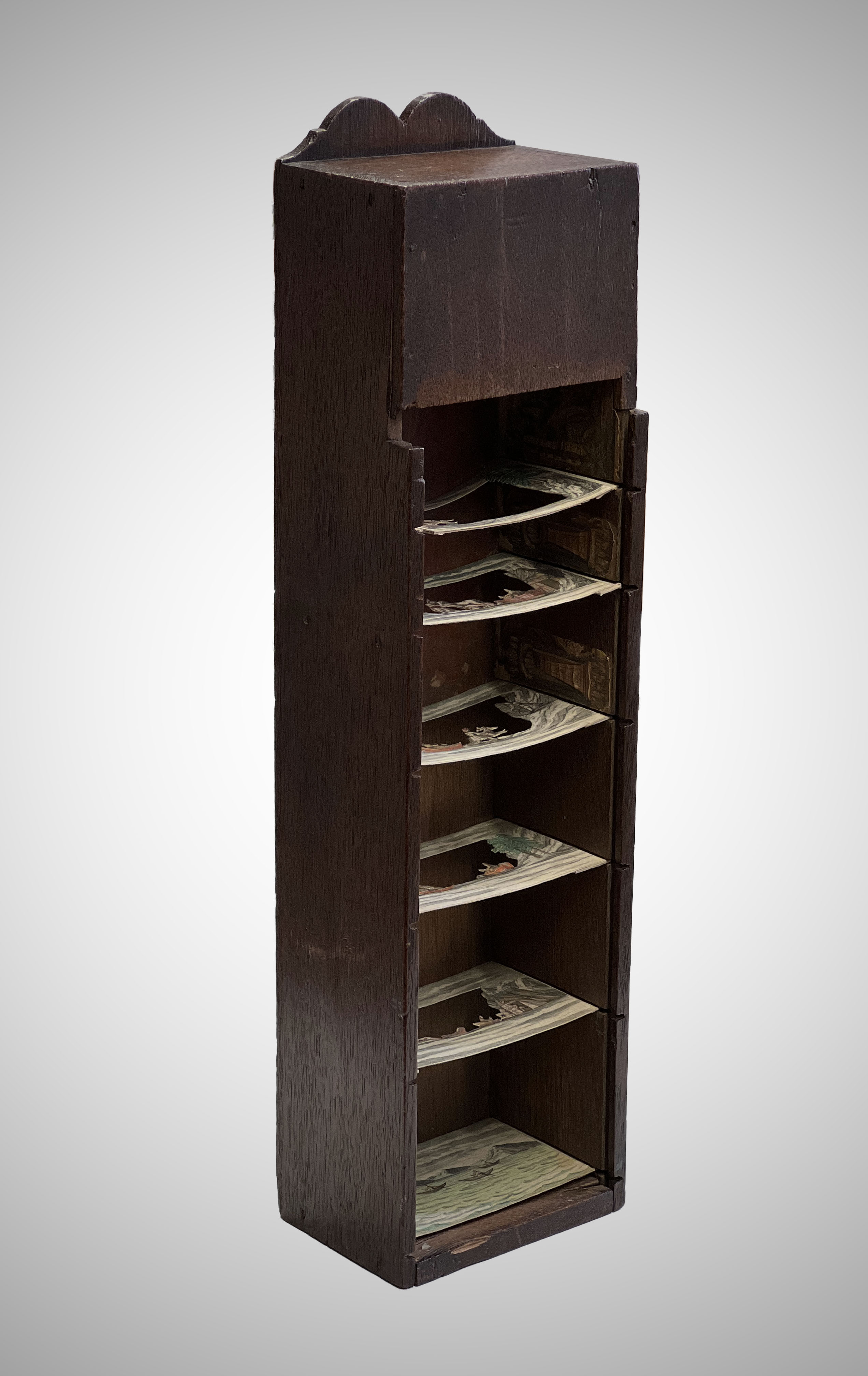 This is a vertical small-lens viewer for 3D scenes composed of a series of 5 overlapping coulisse-frames and a backdrop. It is an example of an "optical machine " and is included in the Optical Machine Taxonomy