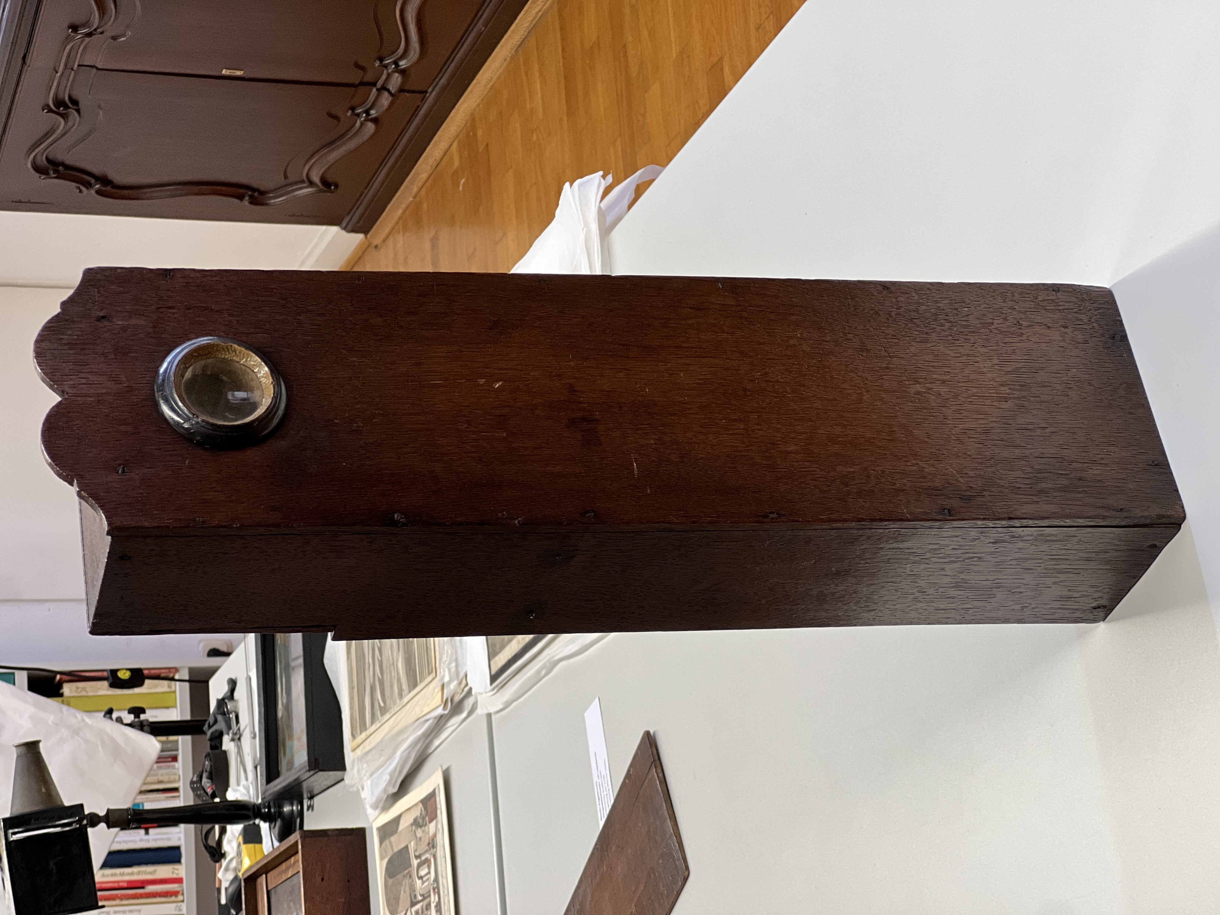 The Box: The box is very simply constructed from oak. Parts are lapped without mitres or dovetails. There are no brass fittings. The lens is secured by some form of white putty. The single double curve, top front, is the only external decoration. The inside of the mirror-case is papered with cutouts from engravings, possibly added by the user.