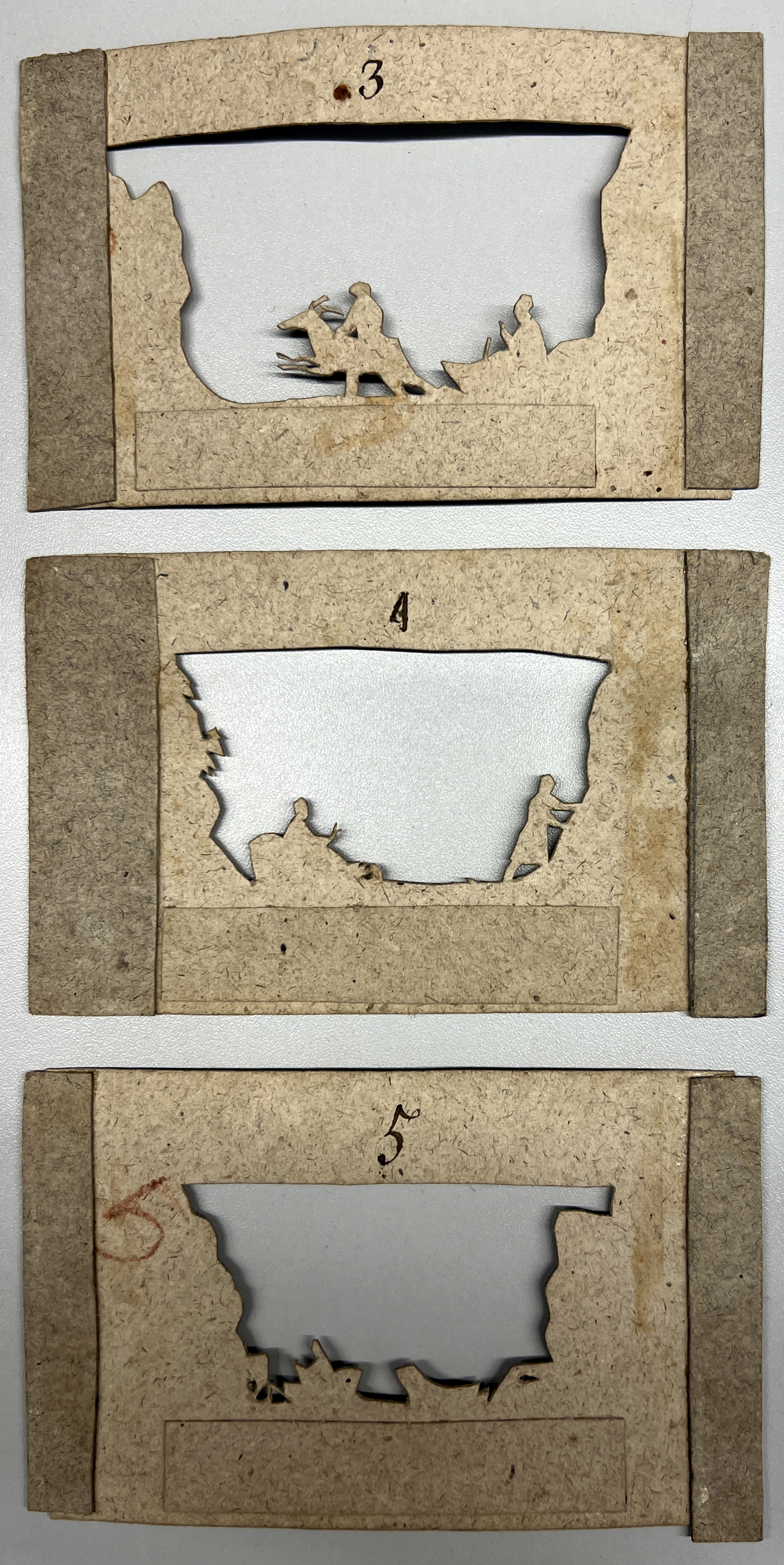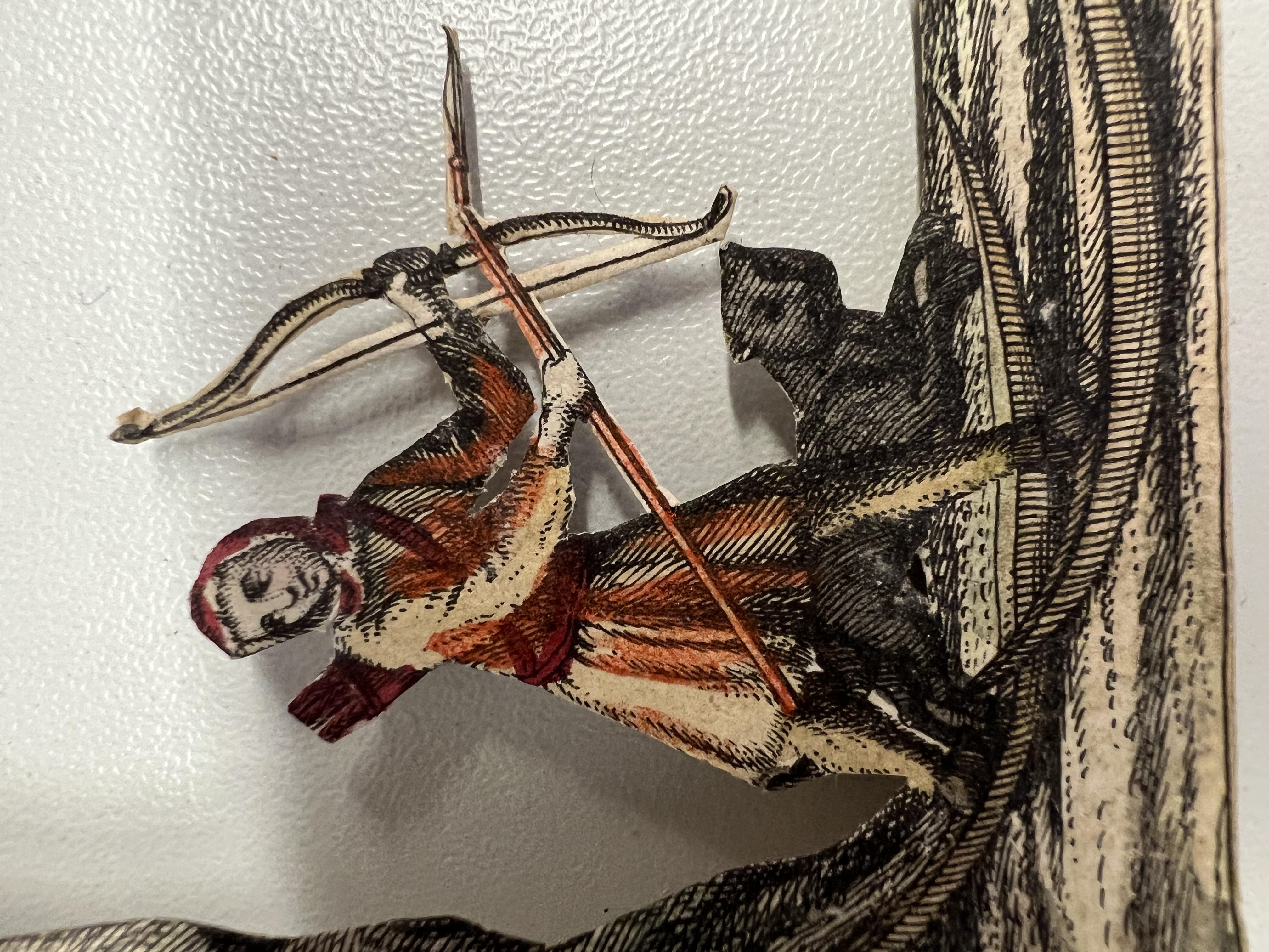 Cutouts: The cut-out openings are very precise: you can see in Figure GT49.6 that the archer's bowstring has been carefully separated from the bow. The slender tip of his spear has weakened but has remained miraculously unbroken for nearly 300 years. By contrast, the cutout silhouettes of later paper theatres only follow generalized outlines. Englebrecht likely contracted out this painstaking work to sweatshops where it could be done cheaply by women and children.[12]