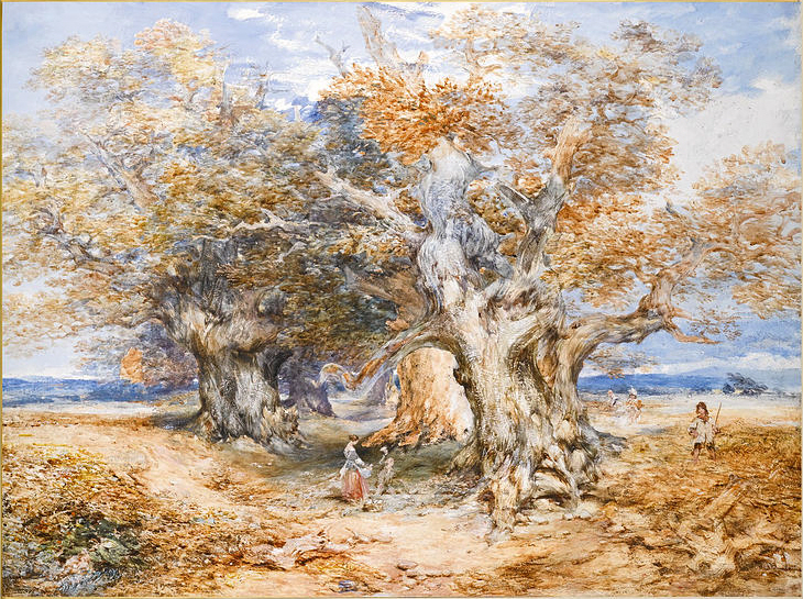 George Cattermole (1800-1868) was an artist in Grundy's personal collection. I have reproduced his painting On the borders of Sherwood Forest (watercolor 76 x 101 cm) on the right. You can see the common interest in great trees. See also Grundy's 'There is a Pleasure in the Pathless Woods.'